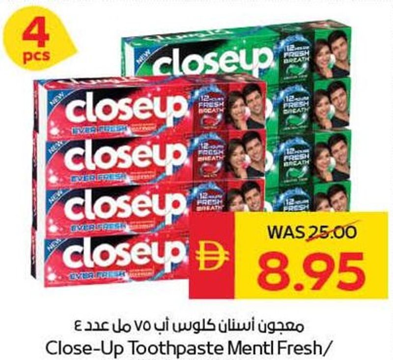 Close-Up toothpaste, Menthol Fresh or Red Hot variants, 4 tubes of 75ml each.