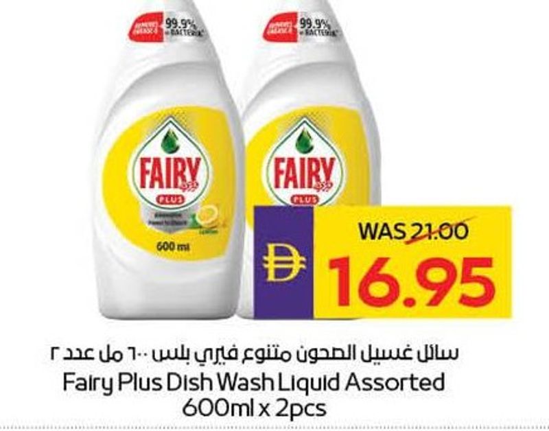 A twin pack of Fairy Plus dish wash liquid, 600ml each, in assorted scents.