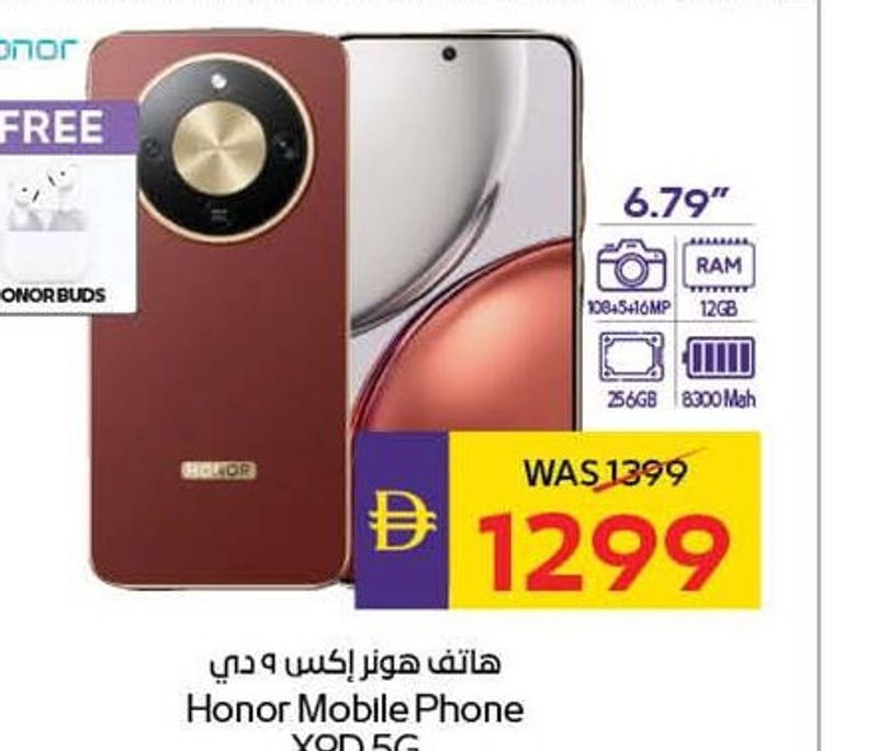 An Honor X9D 5G mobile phone with a 6.79-inch display, 108+5+4+6MP camera, 256GB storage, and 8000mAh battery. Includes free Honorbuds.