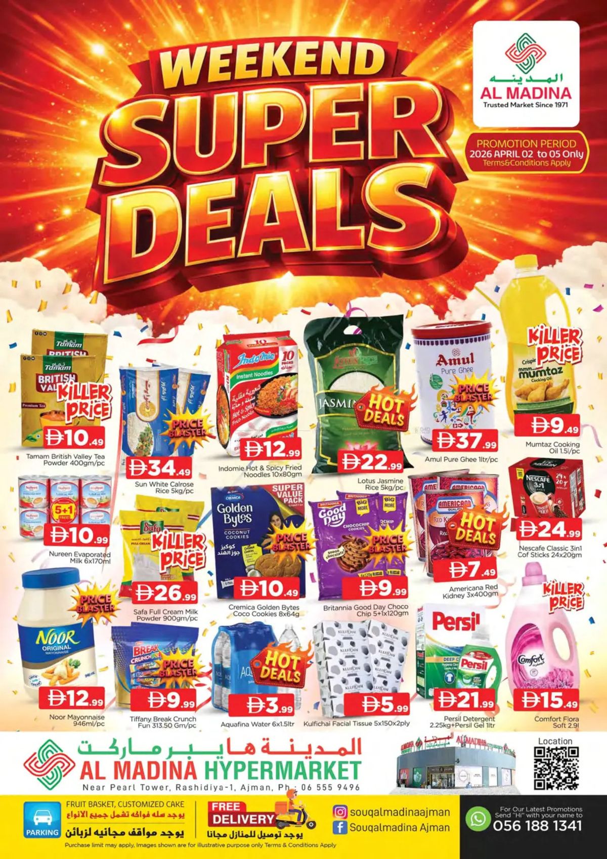 Al Madina Hypermarket has released Super Sale Deals catalog in Ajman, UAE - Al Madina Hypermarket - Rashidiya from Apr 5, 2026 to Apr 5, 2026 in 1 branch(s).