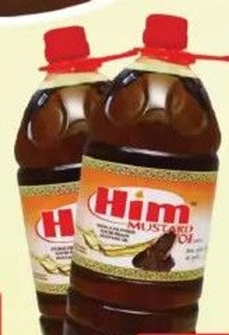 Him brand mustard oil, ideal for cooking, available in a 2-liter bottle.
