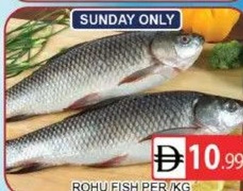 Fresh Rohu fish sold per kilogram, 'Sunday Only' offer.