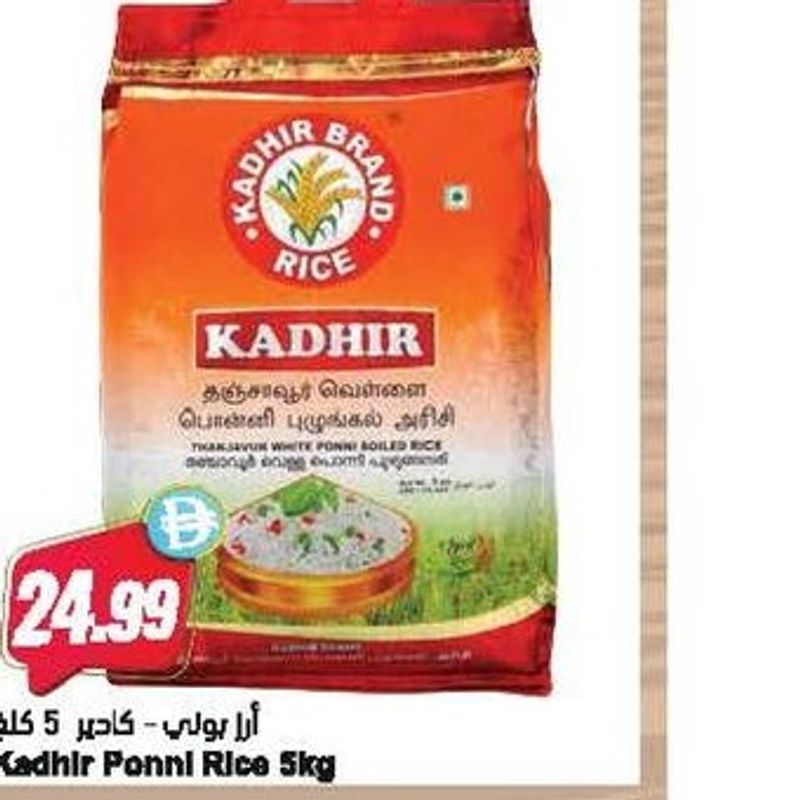 A 5kg bag of Kadhir Ponni Rice, a popular variety of rice known for its soft texture and distinct aroma.