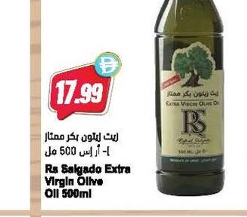 A 500ml bottle of Ra Salgado Extra Virgin Olive Oil, ideal for dressings, dipping, and enhancing the flavor of dishes.