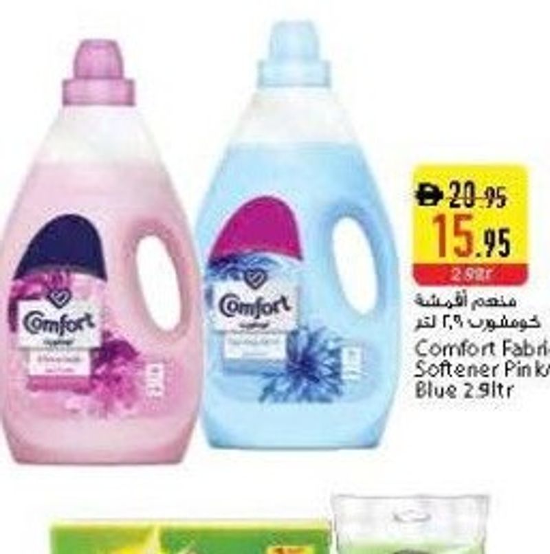 Comfort Fabric Softener, available in pink or blue, 2-liter bottle.