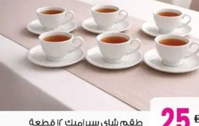 A 12-piece set of ceramic tea cups and saucers, available in assorted designs.