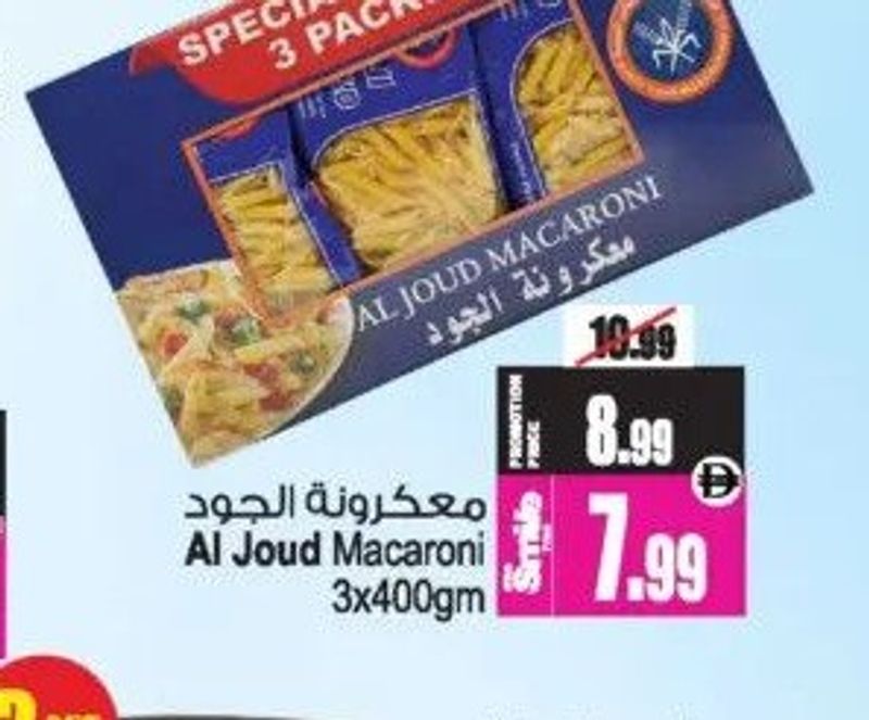 A special offer pack of three 400gm packs of Al Joud Macaroni.