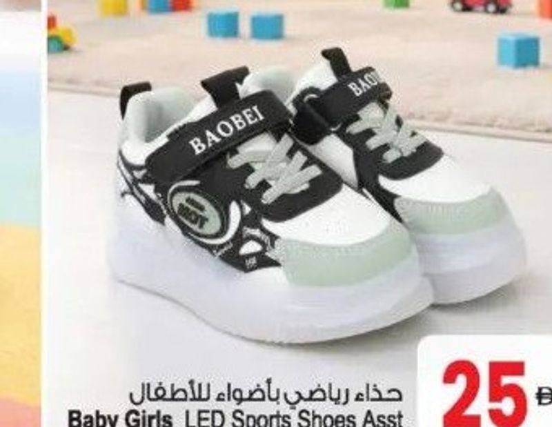 Assorted LED sports shoes for baby girls, available in sizes 25-30.