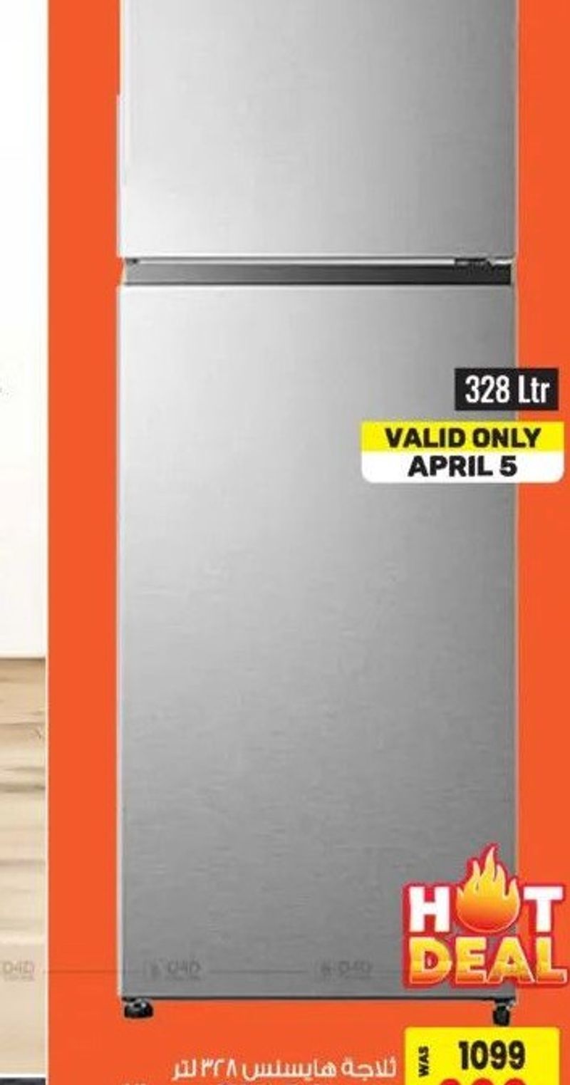 A Hisense 328 Ltr refrigerator, model RT3N328NAI, offered as a hot deal valid only on April 5.