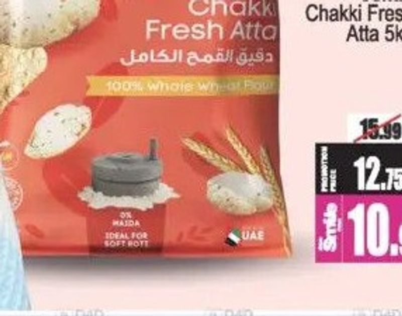 Jenan Chakki Fresh Atta, 100% whole wheat flour in a 5kg bag, on a special 2-day offer.