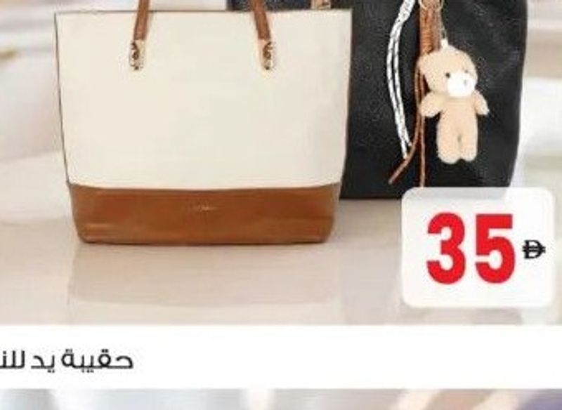 Assorted ladies handbag, two-tone white and brown with a small teddy bear charm.