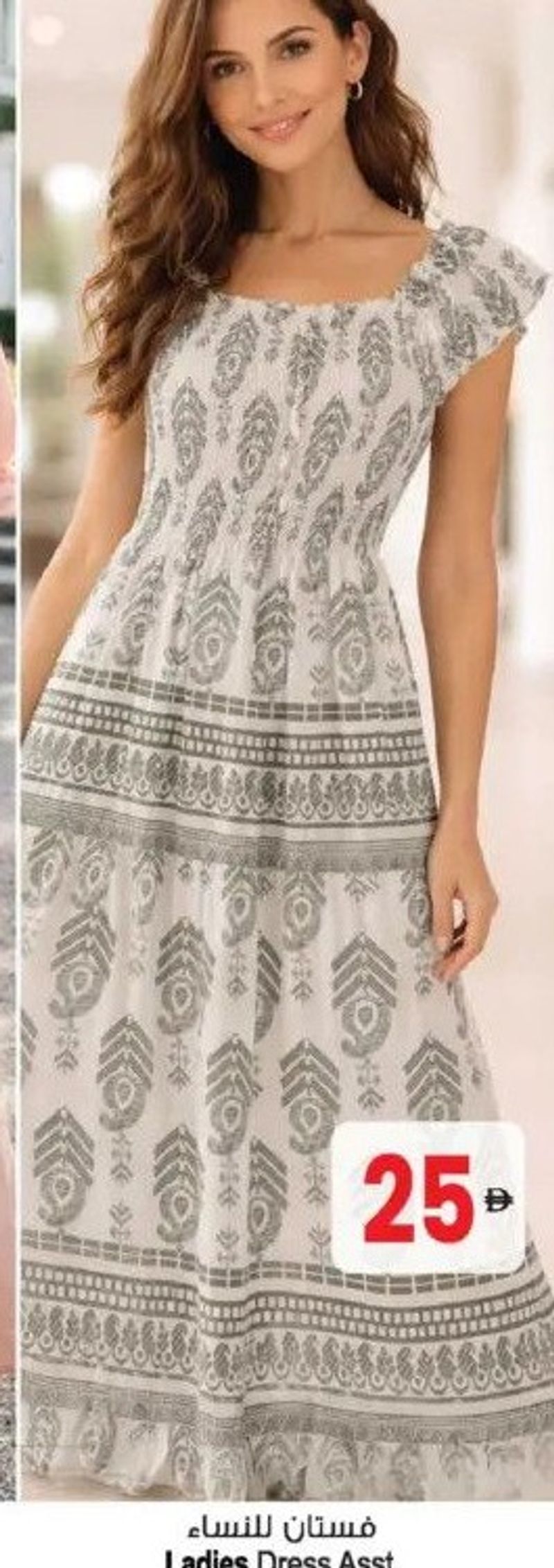 A white and grey patterned ladies dress with short sleeves, available in assorted styles.