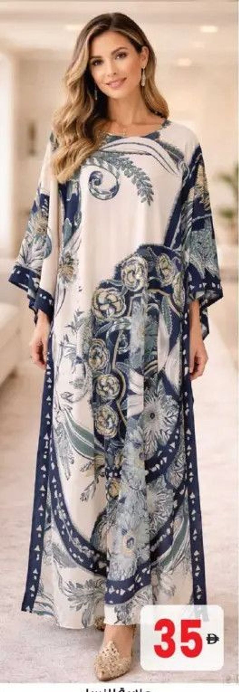 An assorted ladies' jalabiya dress featuring a elegant white and blue pattern.