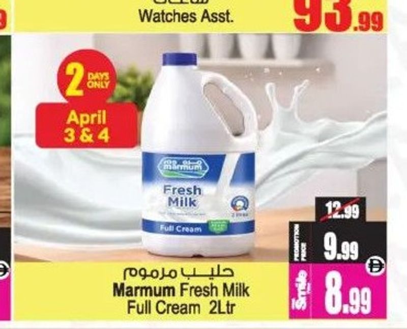 Marmum full cream fresh milk, 2-liter carton, on special offer.