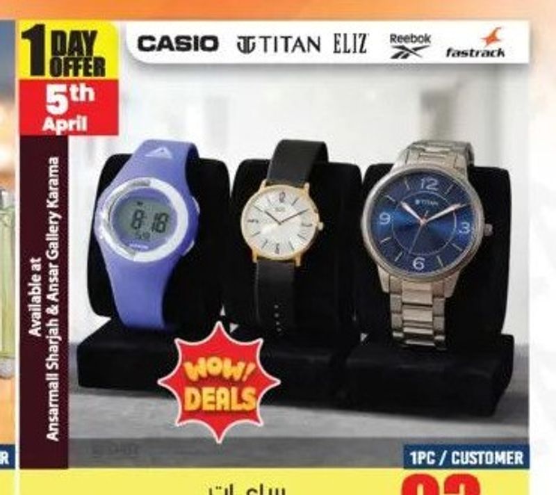 Assorted watches from brands like Casio, Titan, and Fastrack.