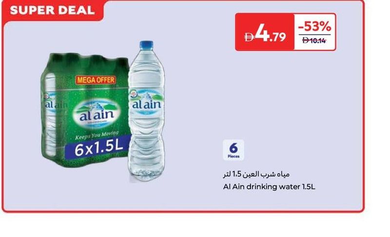 Al Ain drinking water, mega offer pack of 6 bottles, 1.5L each.
