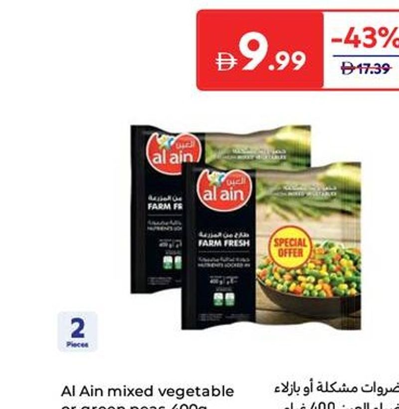 Al Ain frozen mixed vegetables or green peas, 400g packs, for healthy cooking.