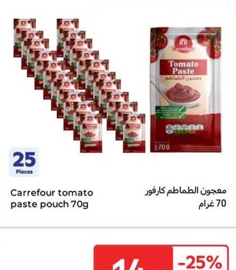 Carrefour tomato paste in 70g pouches, sold as a pack of 25 pieces.