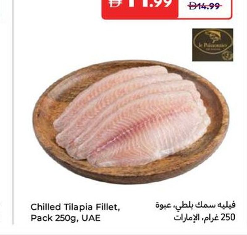 Chilled tilapia fillet, 250g pack, sourced from UAE.