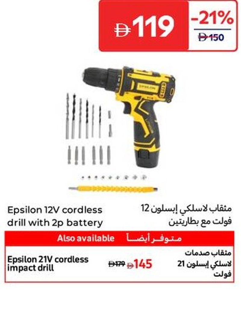 Epsilon 12V cordless drill with 2 batteries. An Epsilon 21V cordless impact drill is also available for 145 AED.