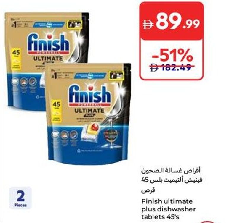 Pack of 2 Finish Ultimate Plus dishwasher tablets, 45 tablets per pack.