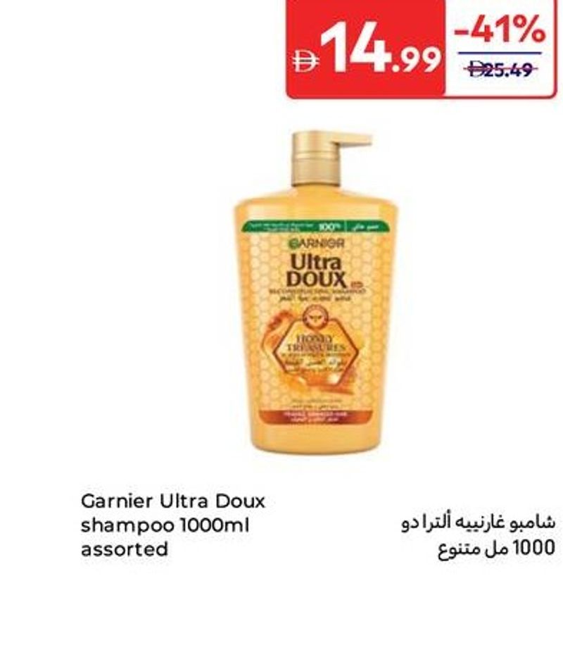 A 1000ml bottle of Garnier Ultra Doux shampoo, available in assorted variants.