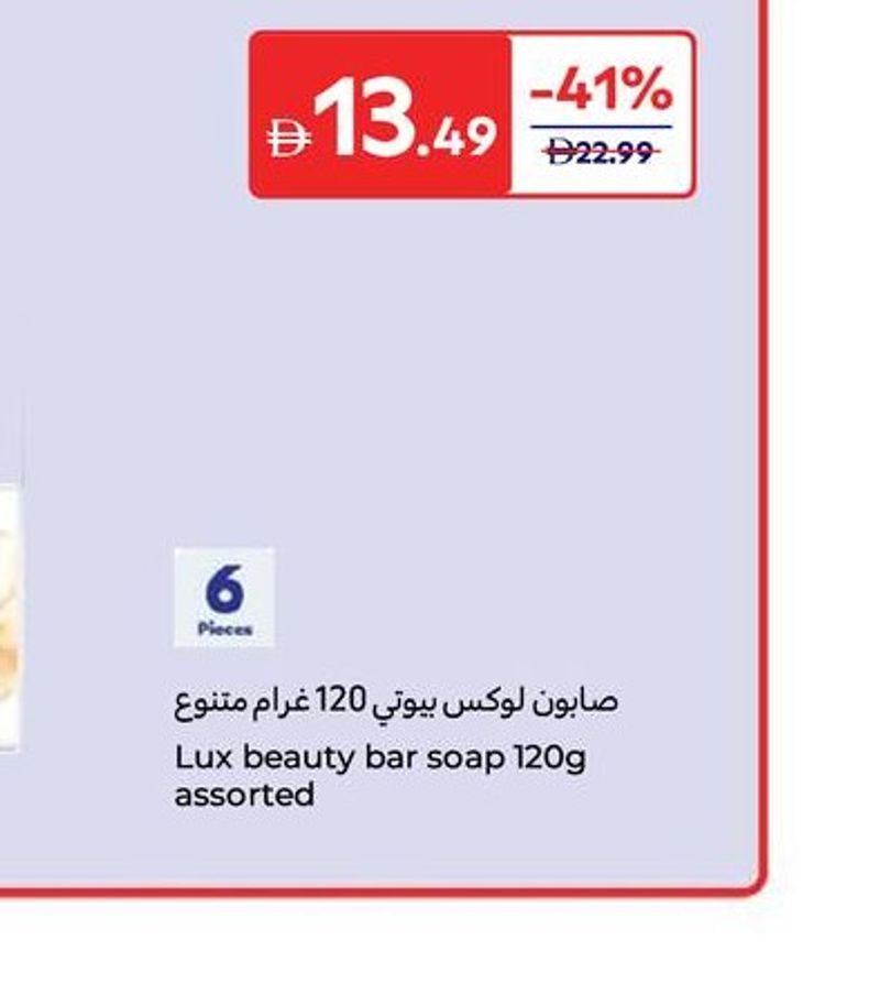 A pack of six 120g Lux beauty bar soaps, offering creamy perfection for smooth fragrant skin, assorted.