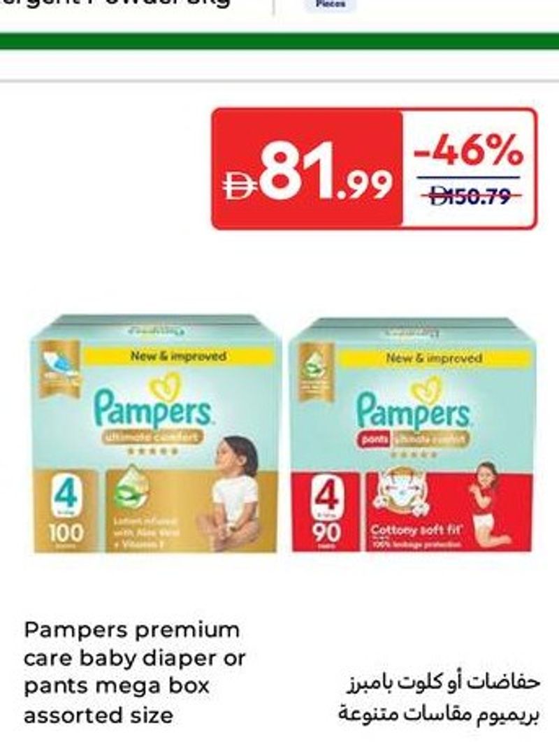 Pampers premium care baby diapers or pants in a mega box, available in assorted sizes.