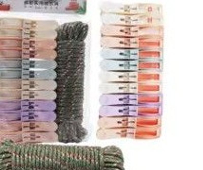 An assorted set of cloth clips and rope, useful for hanging laundry.