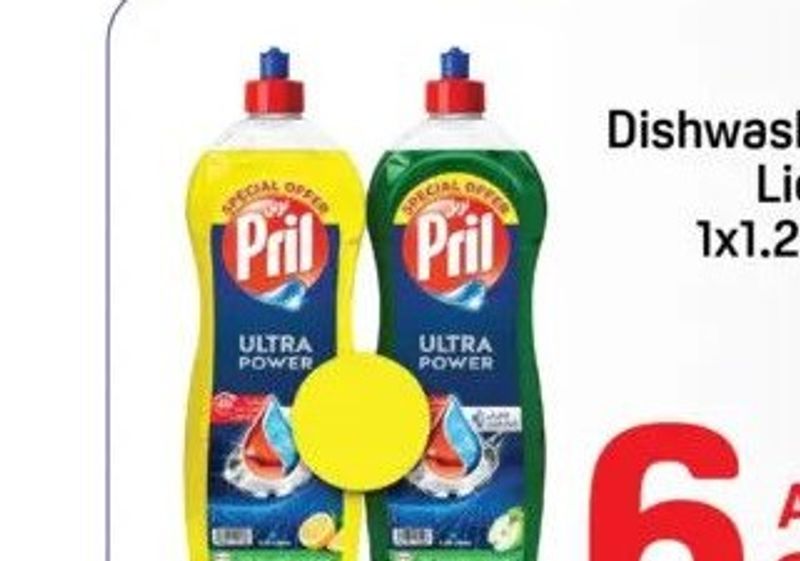 A 1.25 liter bottle of Pril dishwashing liquid.