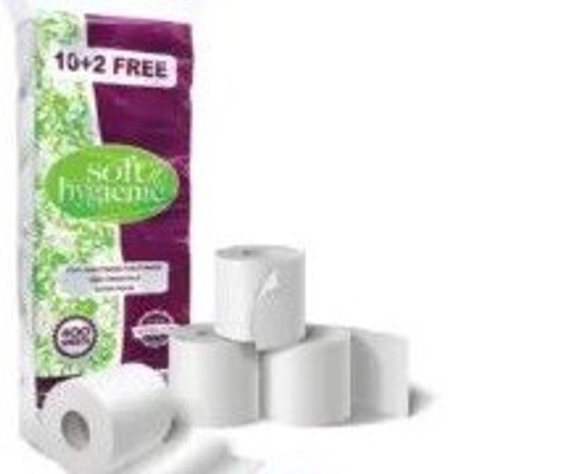 A pack of 12 rolls of Soft n Hygienic toilet paper, each with 400 sheets, for personal hygiene.