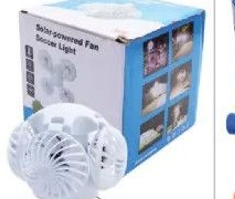 An assorted solar-powered fan with a soccer light design, suitable for portable cooling and lighting.