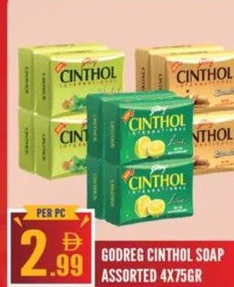Assorted Godrej Cinthol soap bars, available in a pack of 4 x 75g.