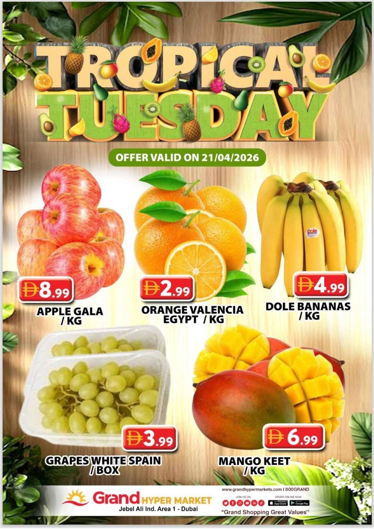 Grand Hypermarket has released Fruitilicious Tuesday catalog in Dubai, UAE - Grand Hypermarket Jebel Ali from Apr 21, 2026 to Apr 21, 2026 in 1 branch(s).