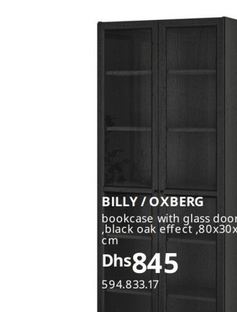 A black oak effect bookcase from the BILLY / OXBERG series, featuring glass doors and dimensions of 80x30x202 cm.