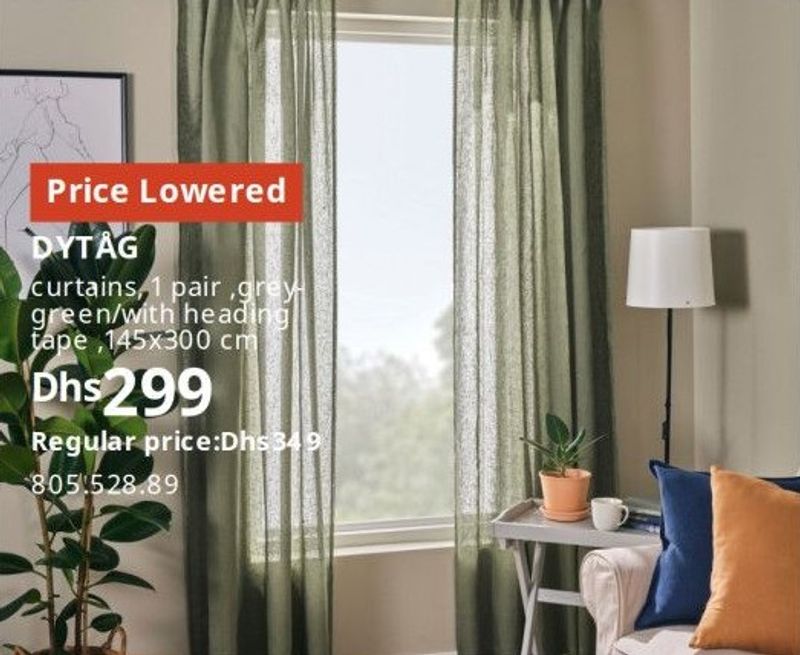 DYTÅG curtains, 1 pair, grey-green/with heading tape, 145x300 cm