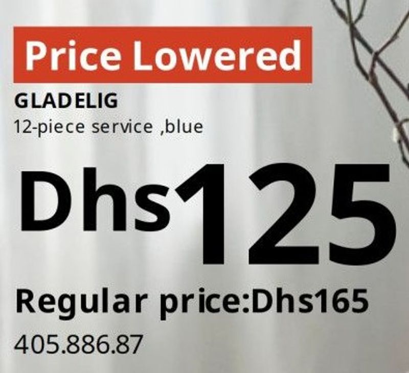 A 12-piece dining service in blue, part of the GLADELIG collection, offered at a reduced price.