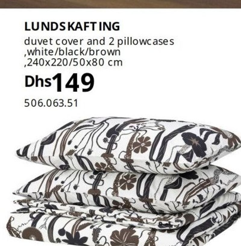 LUNDSKAFTING duvet cover and 2 pillowcases, white/black/brown, 240x220/50x80 cm