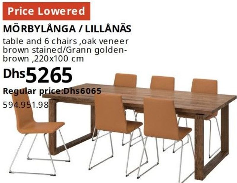 MÖRBYLÅNGA table and 6 chairs, oak veneer brown stained/Grann golden-brown, 220x100 cm