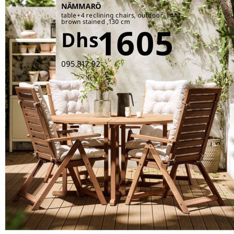 An outdoor dining set from the NÄMMARÖ series, featuring a 130 cm table and 4 reclining chairs, all in a light brown stained wood finish.
