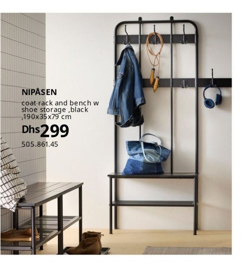 NIPÅSEN coat rack and bench with shoe storage, black, 190x35x79 cm