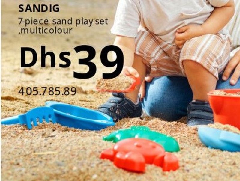 A 7-piece sand play set in multicolour, perfect for children's playtime.