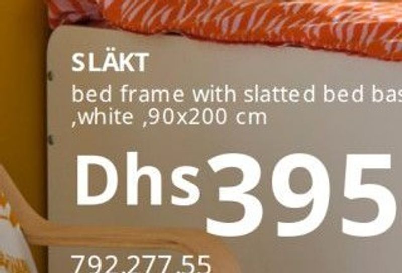 A white SLÄKT bed frame with a slatted bed base, measuring 90x200 cm, designed for comfort and support.