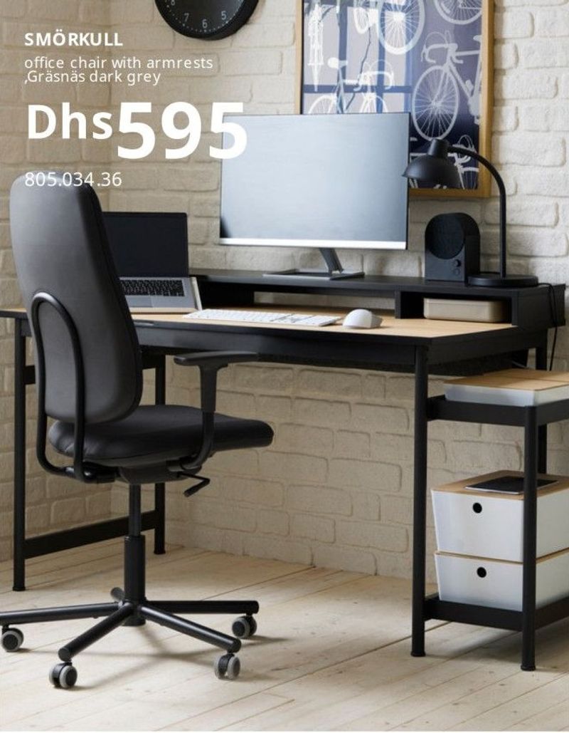 SMÖRKULL office chair with armrests Gräsnäs dark grey