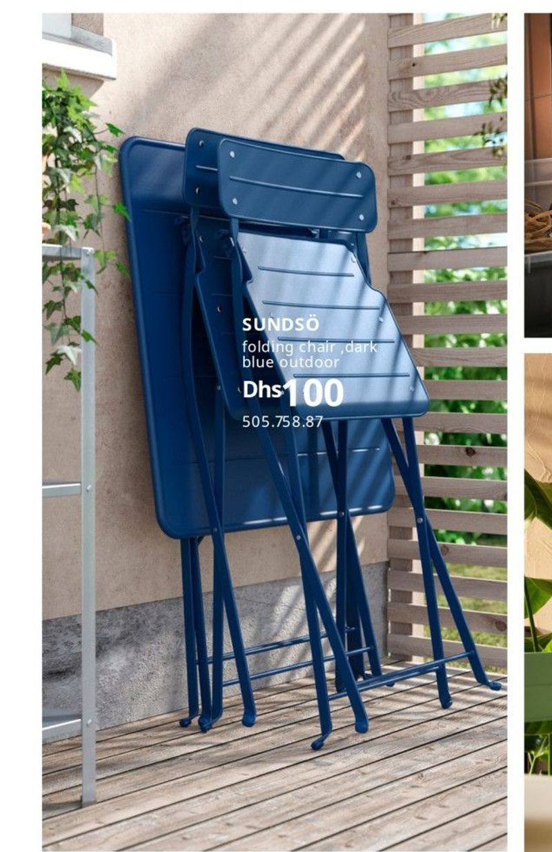 A foldable dark blue outdoor chair from SUNDSÖ, designed for flexible use in outdoor spaces like balconies.