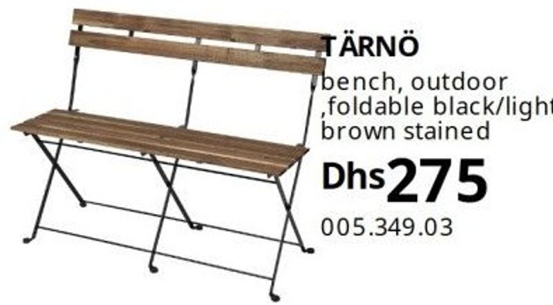 Foldable outdoor bench from the TÄRNÖ series, featuring a black/light brown stained finish, ideal for outdoor seating.