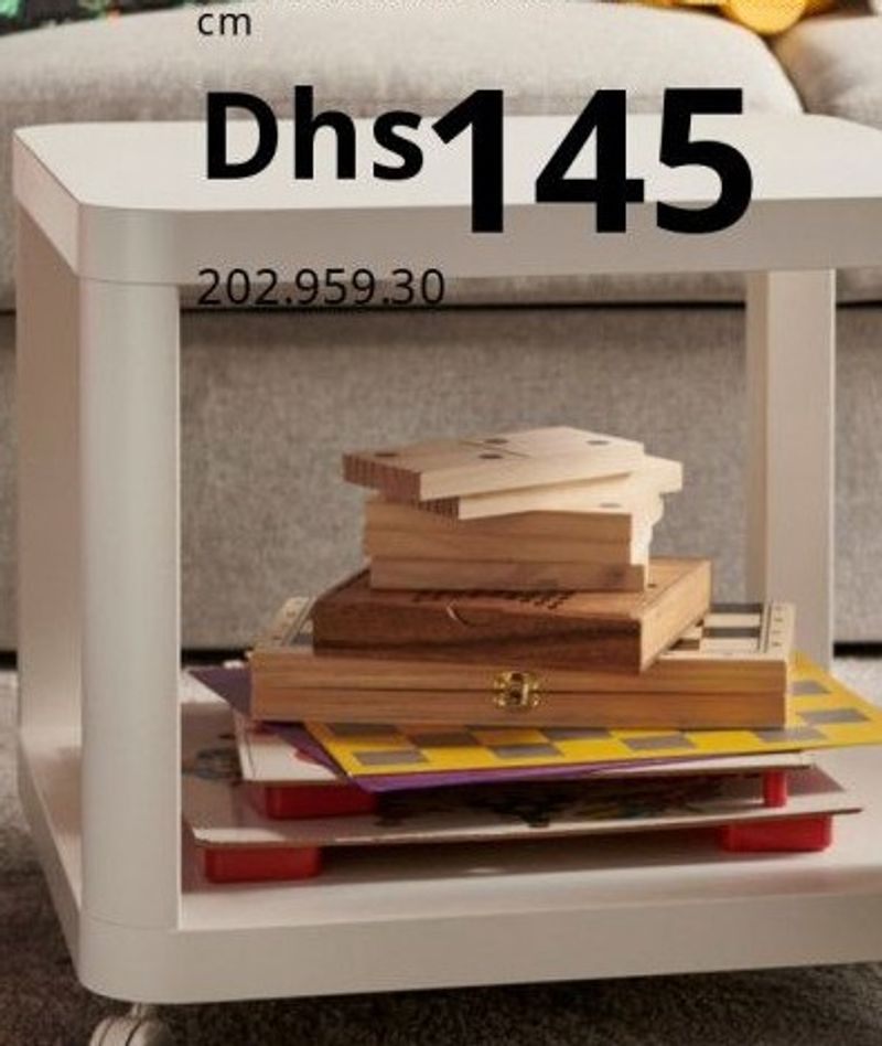 A white side table with castors, measuring 50x50 cm, offering versatile use in any room.