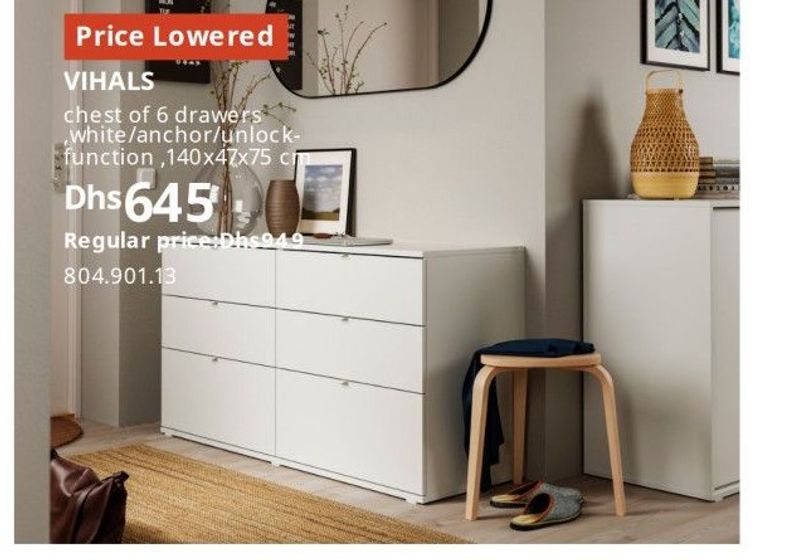 VIHALS chest of 6 drawers, white/anchor/unlock function, 140x47x75 cm