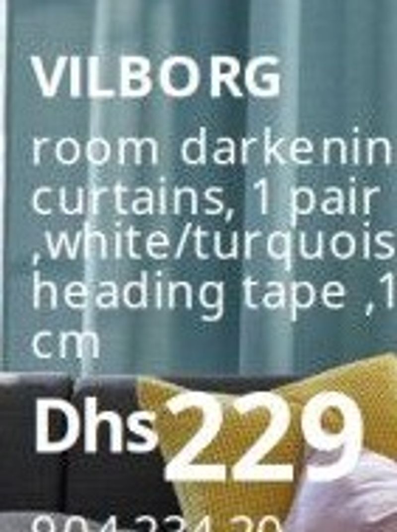 VILBORG room darkening curtains, 1 pair, white/turquoise/with heading tape, 145x300 cm