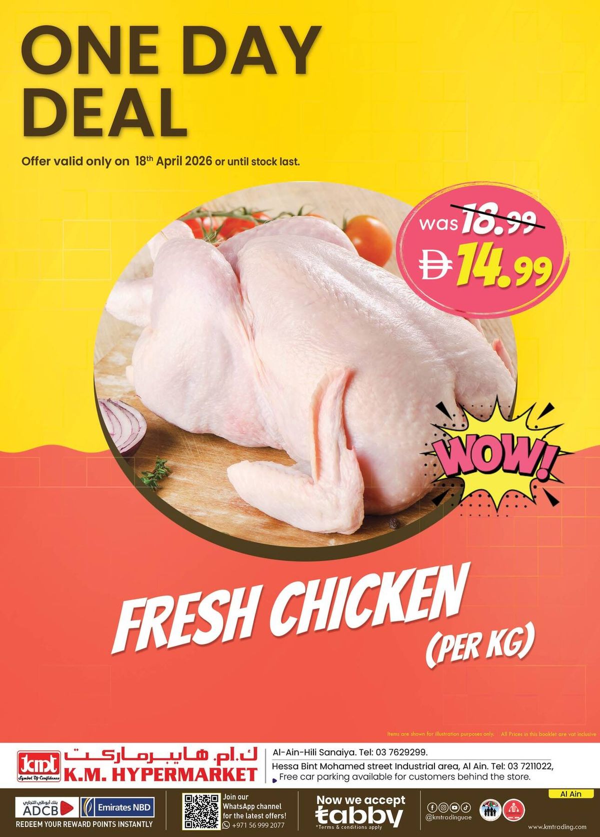 The latest One Day Deal from Km Trading brings a competitive lineup of offers to the UAE market. Valid from Apr 18, 2026 to Apr 18, 2026, this catalog represents one of the strongest mid-week promotional drops we track in the region. At Cliq Deals, we analyze hundreds of retail circulars, and Km Trading consistently delivers value on bulk grocery staples, fresh produce, and household essentials.
